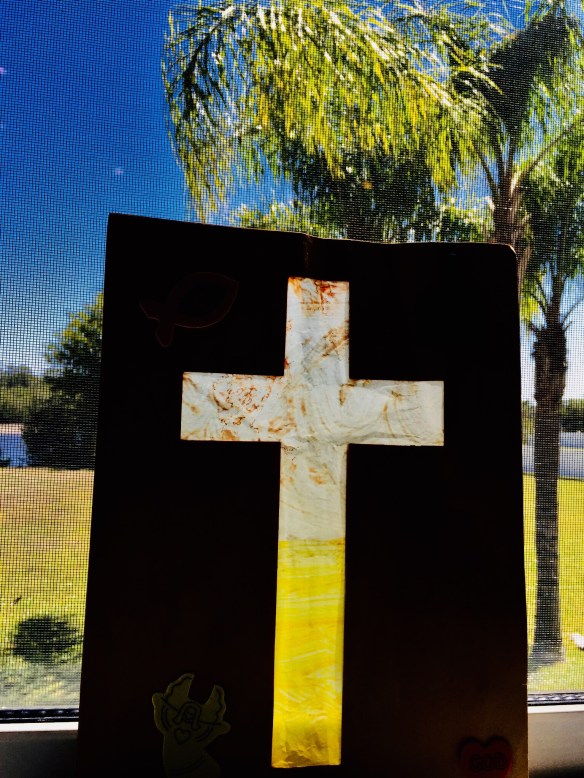 (My youngest daughter – now 16 – made this at church in pre-K when she was 4. I’ve put it in this spot at Easter ever since)